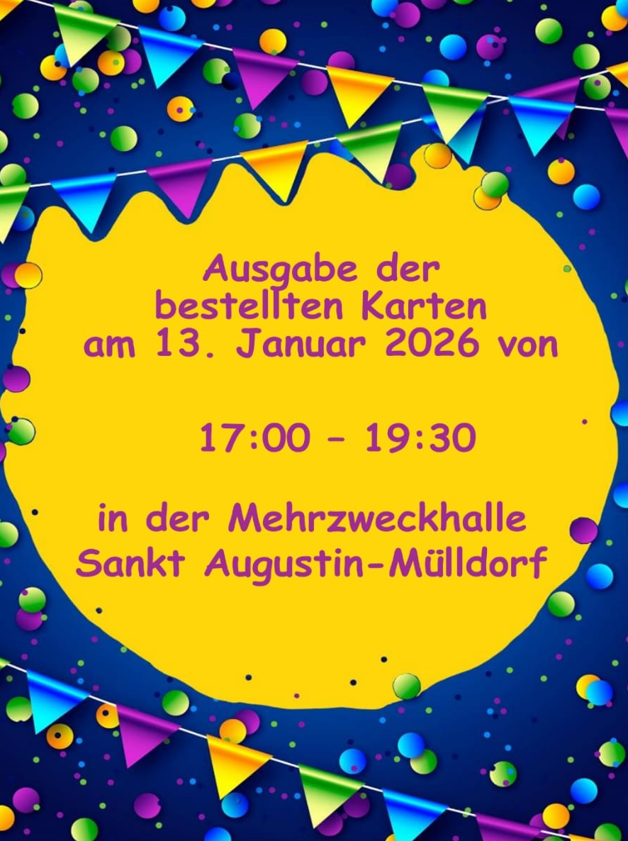 Der Kartenverkauf für die bestellten Karten findet am 09.01.2024 in der Zeit von 17:00 -19:30 Uhr in der Mehrzweckhalle in Mülldorf statt.