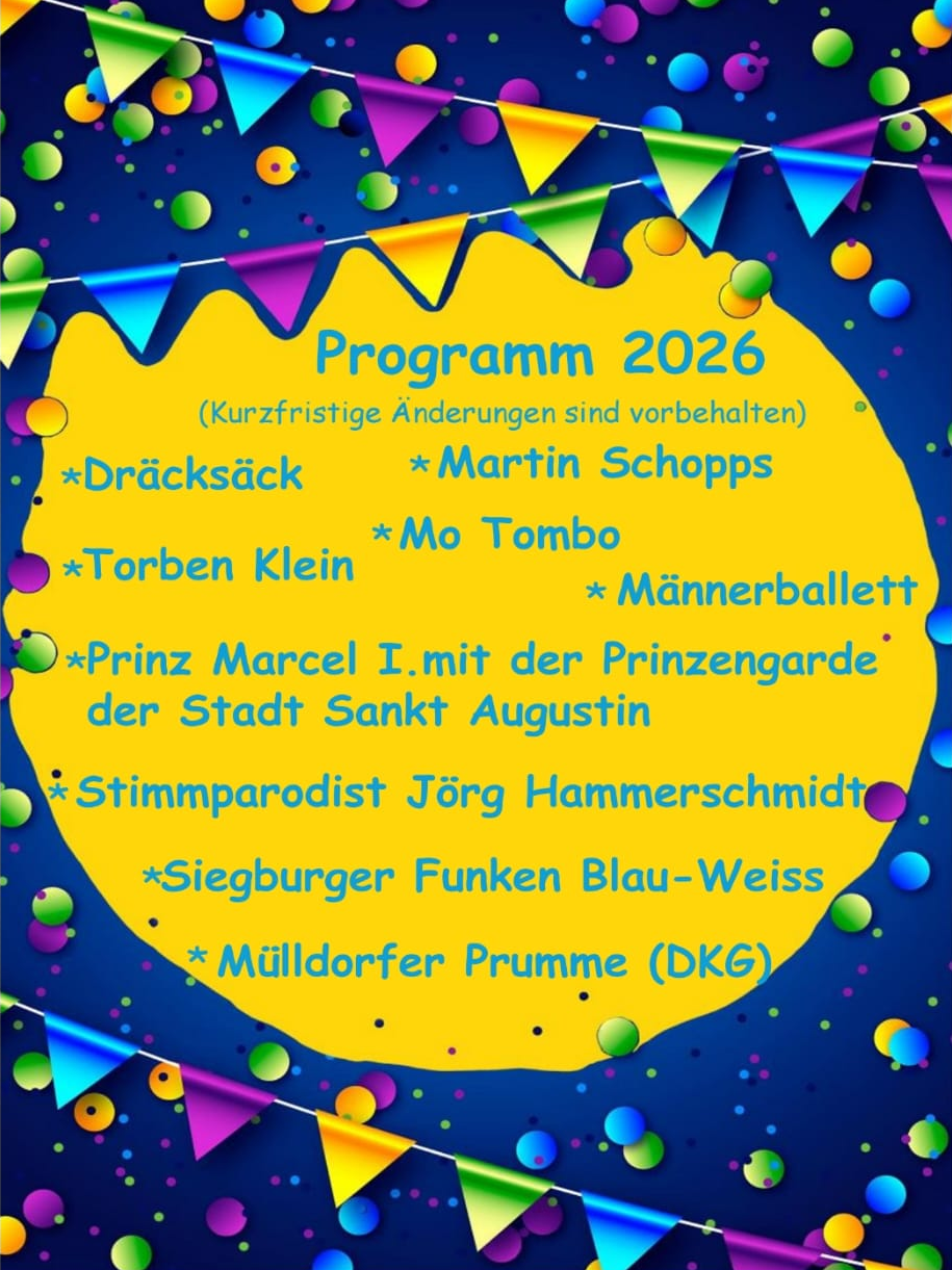 Folgende Künstler hatten wir u.a. für unsere Weiberfastnacht-Sitzung am 27.02.2025 verpflichtet: Einmarsch mit dem Dreigestirn der Stadt Sankt Augustin und der Prinzengarde, Lieselotte Lotterlappen, im Foyer der Mehrzweckhalle Mülldorf (Bonner Str. 102, 53757 Sankt Augustin). |